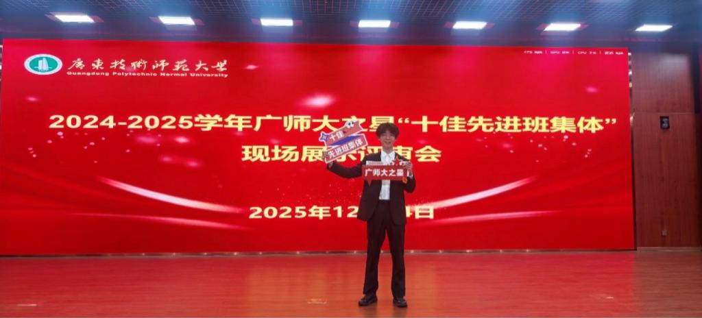 2025年12月24日,广东技术师范大学白云校区,“广师大之星”十佳先进班集体评选现场气氛热烈。代表低空技术与工程学院出战的24大数据1班班长林俊滨从容走上答辩台,通过扎实的班级建设数据、生动的成果案例和富有感染力的现场展示,从全校17个优秀候选班级中脱颖而出,一举夺得“广师大之星”十佳先进班集体与“最佳人气班级”两项荣誉,成为本届评选唯一“双料冠军”!